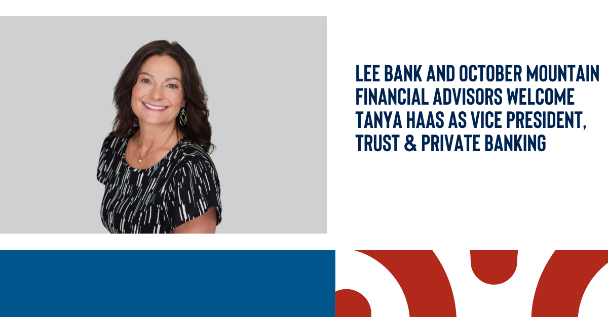 Lee Bank and October Mountain Financial Advisors (OMFA) are pleased to welcome Tanya Haas as Vice President, Trust & Private Banking. In this dual role, Tanya will support clients of both organizations with personalized guidance in trust services and wealth management. She will be based at the OMFA and Lee Bank offices on South Street in Pittsfield.